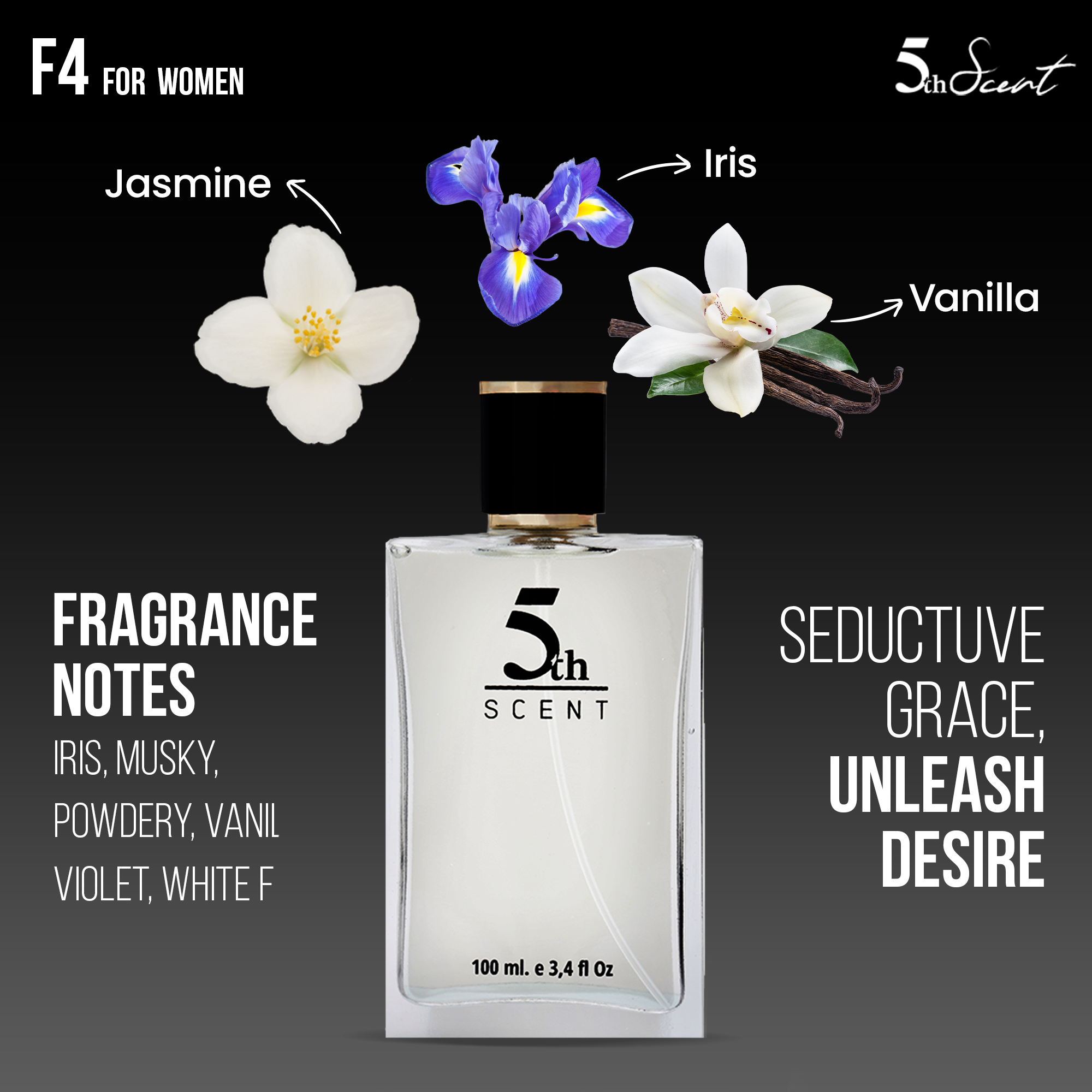 Combining notes of Iris, Musky, Powdery, Vanilla, Violet, White Floral F4 gives off elegant-but-seductive vibes.